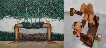 Gérard Battreau raconte qu’à son arrivée en 2000 à Bangui, il a été étonné de voir de multiples tableaux de forêts. MICHEL OUABANGA ne peignait que des forêts et cela faisait déjà quarante ans qu’il peignait ! Mais voilà qu’un jour, sa femme meurt. Les parents pensent que des mauvais esprits l’ont ensorcelée et transformée en vache. Il va voir un médecin traditionnel qui lui dit d’aller trouver le voisin, auteur du maraboutage !  Mais celui-ci, bien sûr, ne peut pas redonner à la femme sa forme première. On rase la case du voisin. Et cela se passe en 2000 !  En somme, de peur d’être métamorphosé en quelque chose d’inattendu, l’artiste se repose en peignant des forêts !