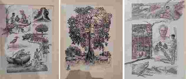 Sont présentés à Fontenoy quelques-uns de ses tableaux. En somme, il veut, par un procédé nouveau, transmettre les coutumes centrafricaines aux gens qui verraient ses œuvres. L’un de ses tableaux résume un conte national. Il est difficile de lire les textes qu’il a intégrés aux tableaux. Gérard Battreau en a traduit le contenu :