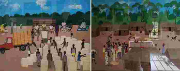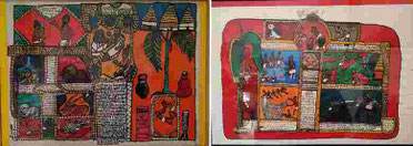 L’artiste suivant, JEROME RAMEDANE, a une autre démarche : il aime décorer les cases. Il peint donc dessus et dans l’environnement, des animaux, des scènes de chasse, la culture du coton, des récits particuliers, bref, il décore les villages. Mais il sent bientôt qu’il a fait le tour de ses possibilités, et part vers la ville de Bangui. Il peint en cours de route pour assurer sa subsistance. Il arrive un jour à une communauté religieuse, où il se trouve bien. Un des membres le voyant peindre sur les cases lui suggère de peindre sur du papier, et propose de lui en acheter. On lui fournit le matériel nécessaire, il peint et en même temps il cultive son jardin.